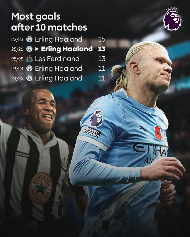 同时,本赛季10轮联赛过后,哈兰德在英超已经打入13球,甚至超过了10支英超球队的总进球数。