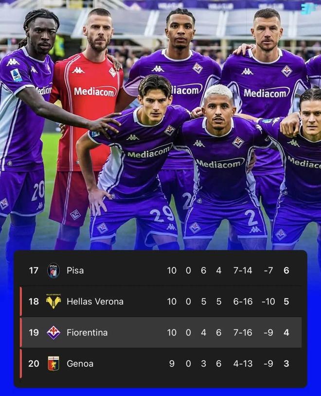 值得一提的是,佛罗伦萨在本赛季意甲前10轮比赛中难求一胜,战绩仅为4平6负,目前只排在联赛积分榜倒数第2位。