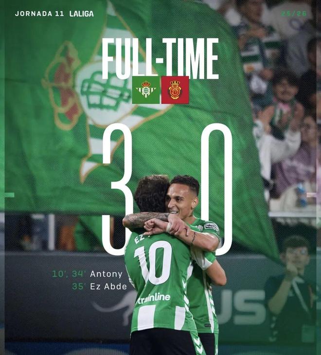皇家贝蒂斯3-0击败马略卡,安东尼在本场比赛当中首发出场,他先是自己打进两球,之后又助攻阿布德打进一球,直接参与了球队的全部进球。